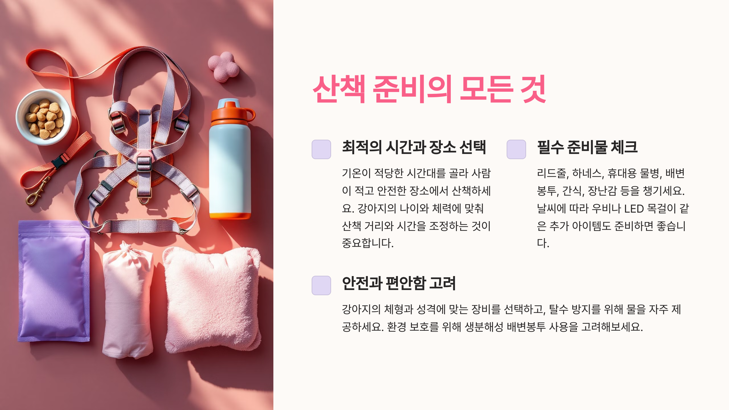 산책 준비물을 꼼꼼히 챙기면 돌발 상황에 대비할 수 있습니다.
