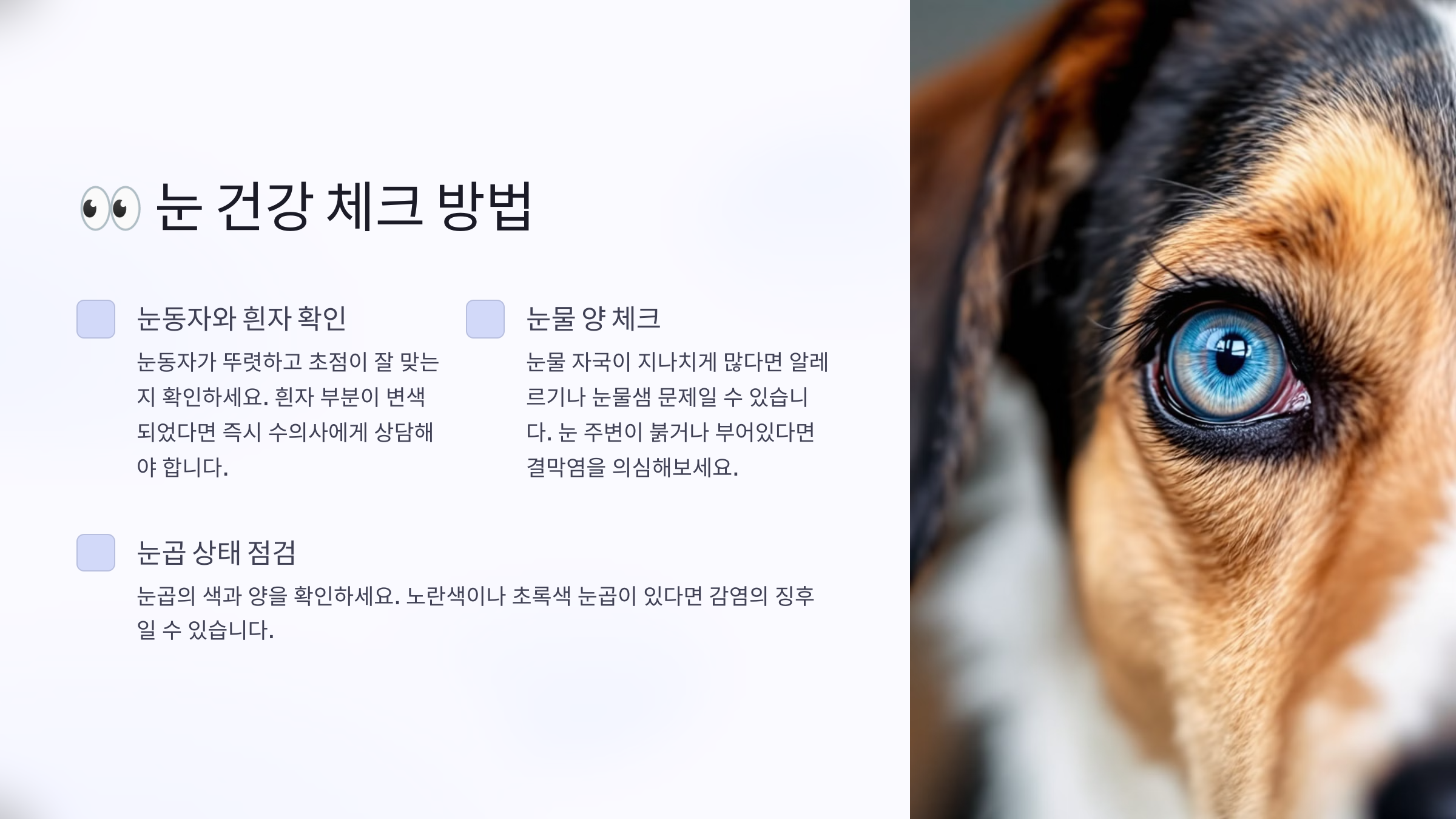 - 매일 강아지의 눈 상태를 빠르게 체크하세요. 특히 활동량이 많은 강아지일수록 자주 확인하는 것이 중요합니다.