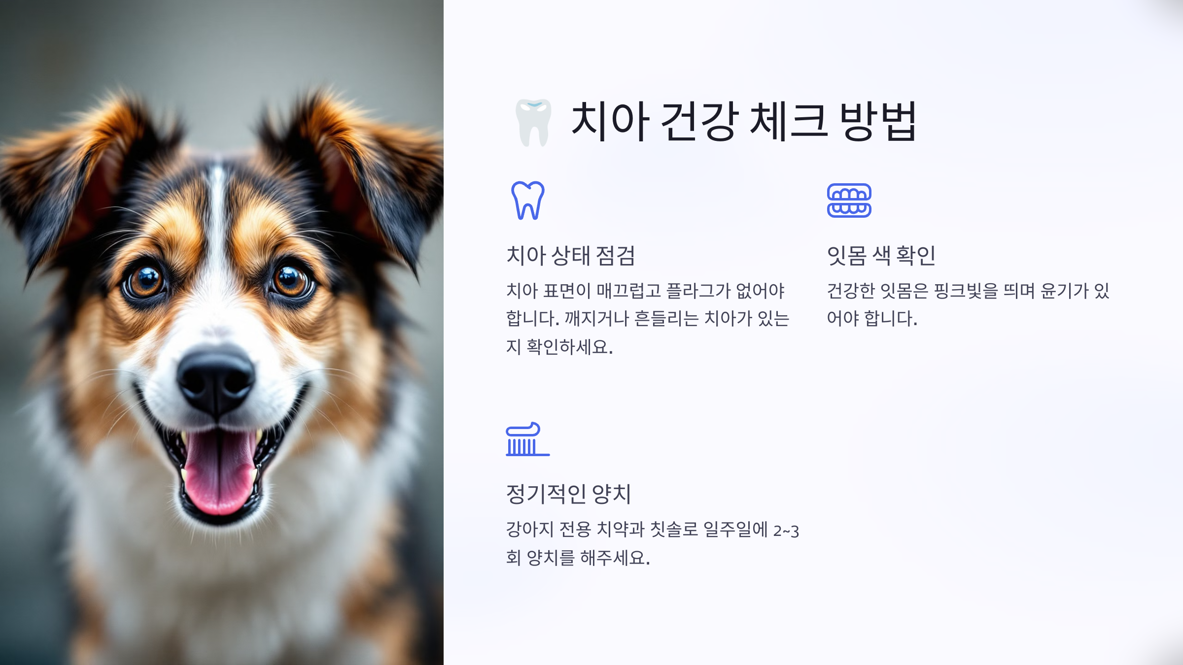 치아와 잇몸은 강아지의 소화기 건강과 직접적으로 연결됩니다. 깨끗한 치아와 건강한 잇몸을 유지하는 것이 중요해요.