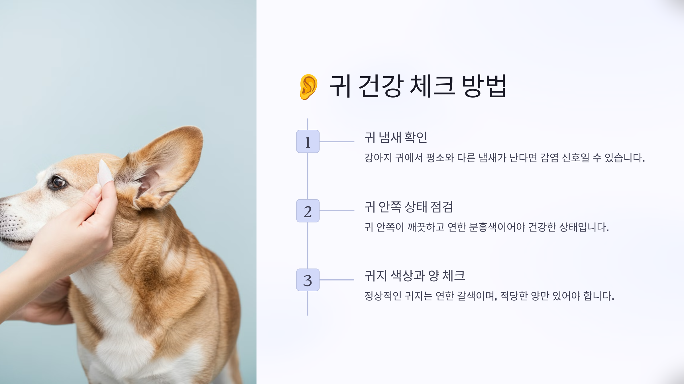 - 매일 빠르게 확인하고, 주 1~2회 더 세심히 점검하세요. 특히 귀가 축 처진 품종(예: 코카 스파니엘)은 더 자주 확인해야 합니다.
