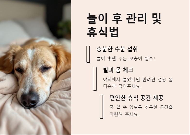 ✅ 무리한 운동 금지 – 강아지의 체력에 맞게 놀이 강도를 조절하세요. 특히 어린 강아지나 노령견은 운동량을 조절해야 하며, 무리한 활동은 관절에 부담을 줄 수 있습니다. 놀이 중 강아지가 지쳐 보이거나 혀를 과하게 내밀고 헥헥거린다면 즉시 휴식을 취해야 합니다.