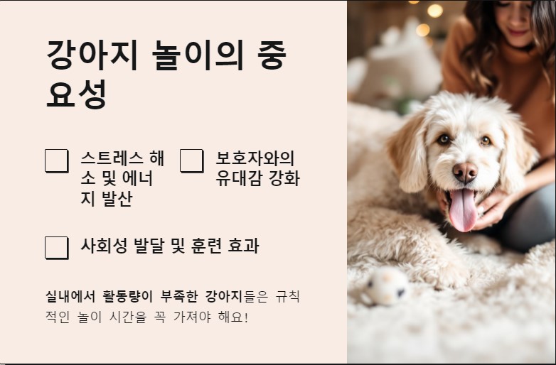 특히 실내에서 활동량이 부족한 강아지들은 규칙적인 놀이 시간을 꼭 가져야 해요!