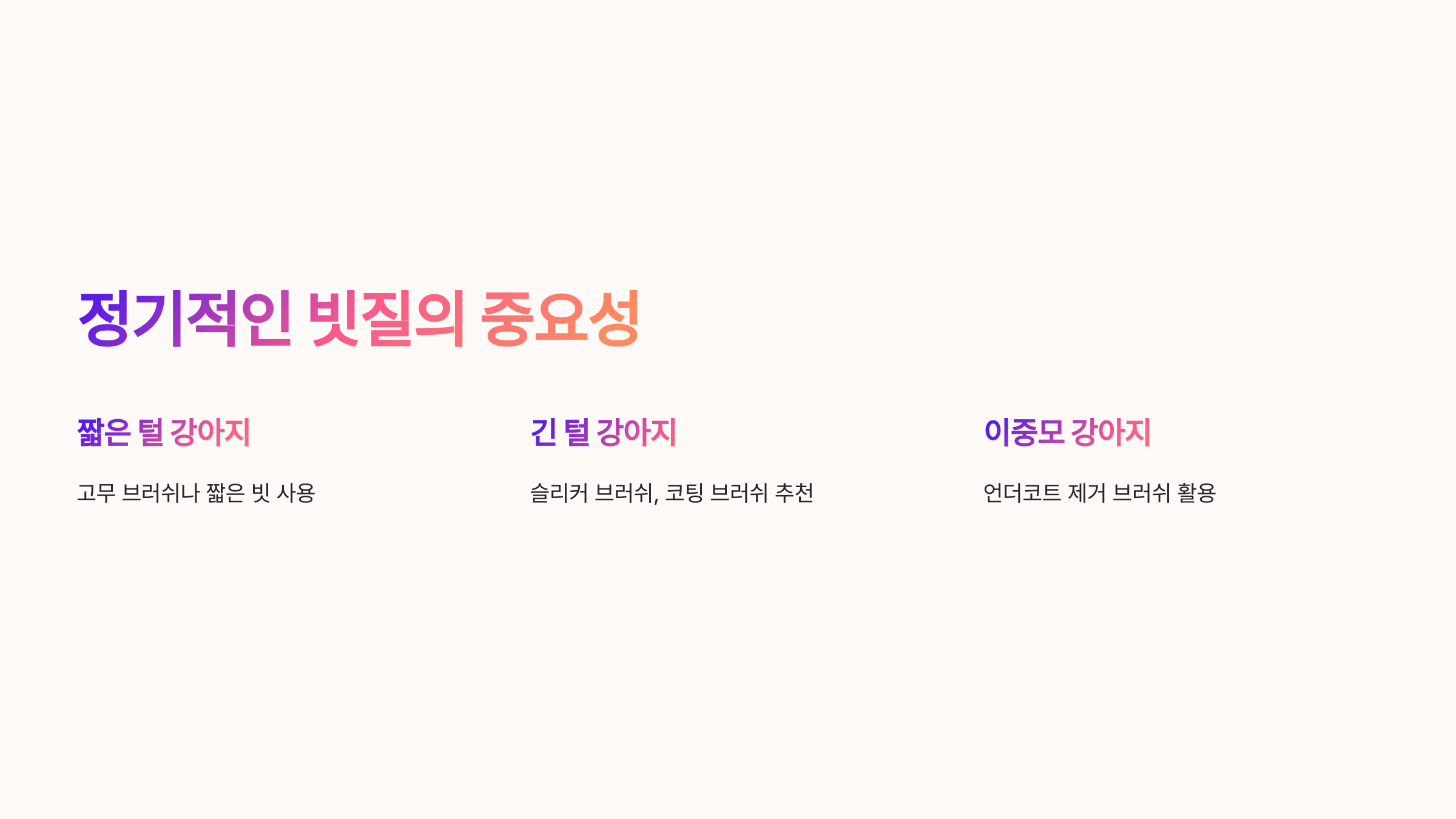 ✅ 짧은 털 강아지: 고무 브러쉬나 짧은 빗을 사용하여 부드럽게 빗질해 주세요. 털이 피부에 밀착되어 있으므로 가볍게 마사지하듯 빗는 것이 좋습니다.