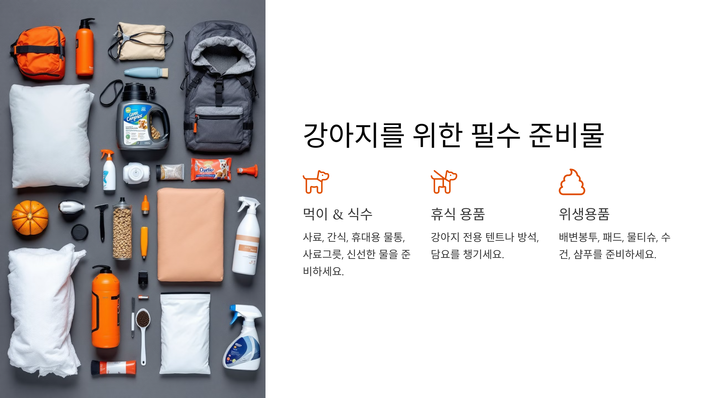 강아지를 위한 준비물을 미리 체크해 두면 캠핑이 훨씬 수월해집니다. 강아지의 건강과 안전을 위해 필수적인 물품을 빠짐없이 챙기는 것이 중요합니다.