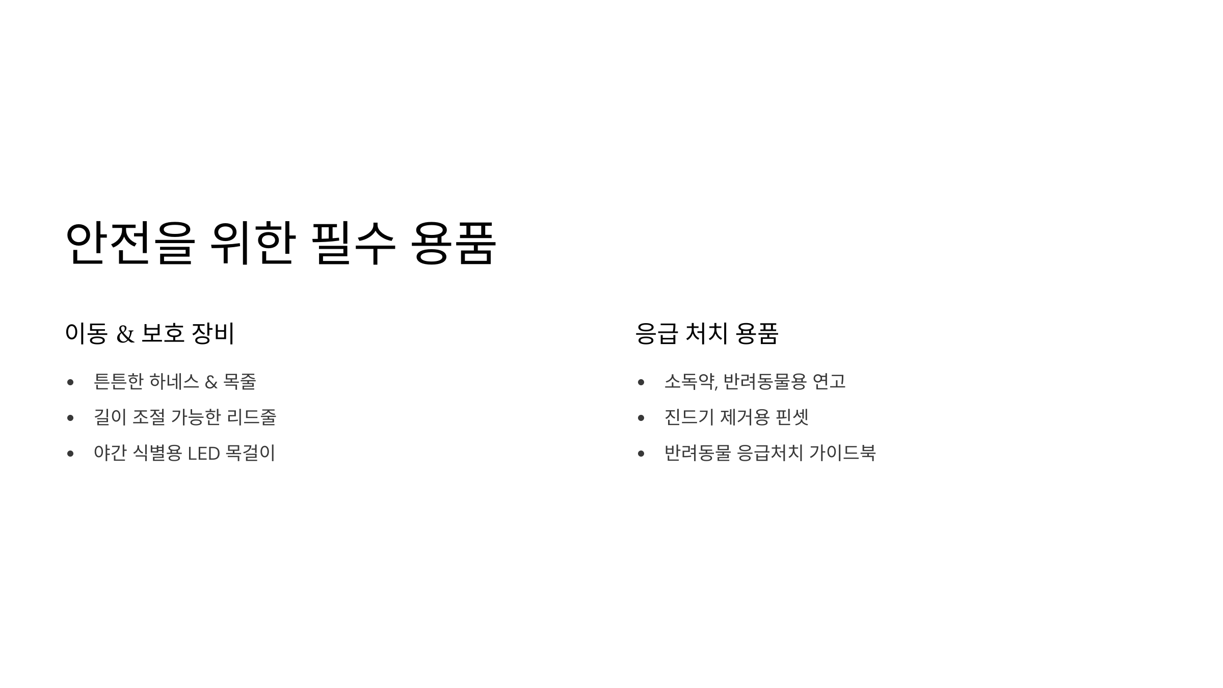 - 반려동물 응급처치 가이드북 (응급 상황 시 대처법 숙지)
