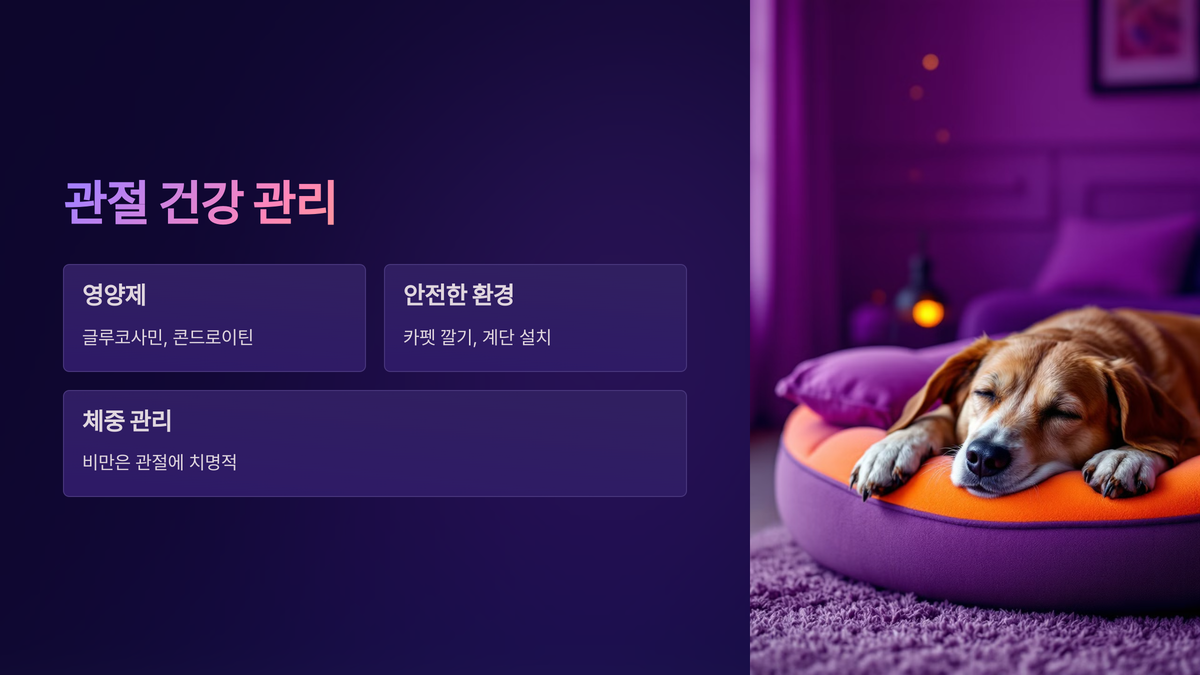 이러한 관리 방법을 꾸준히 실천하면 노령견의 관절 건강을 유지하는 데 큰 도움을 줄 수 있습니다!