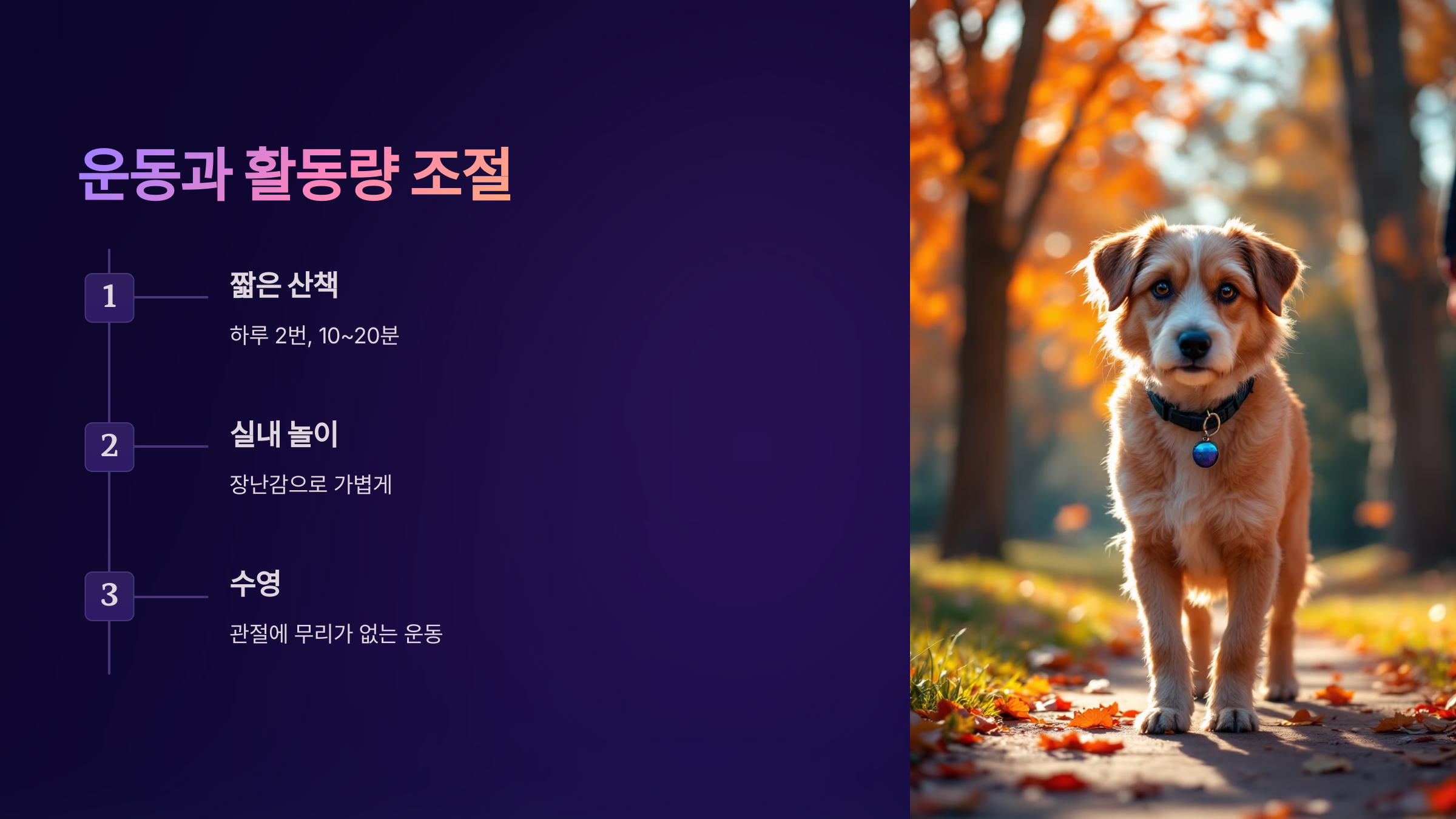 ✅ 스트레칭과 마사지 병행: 가벼운 마사지와 스트레칭은 근육과 관절의 유연성을 유지하는 데 도움이 돼요. 산책 전후로 다리를 부드럽게 늘려주면 좋아요.
