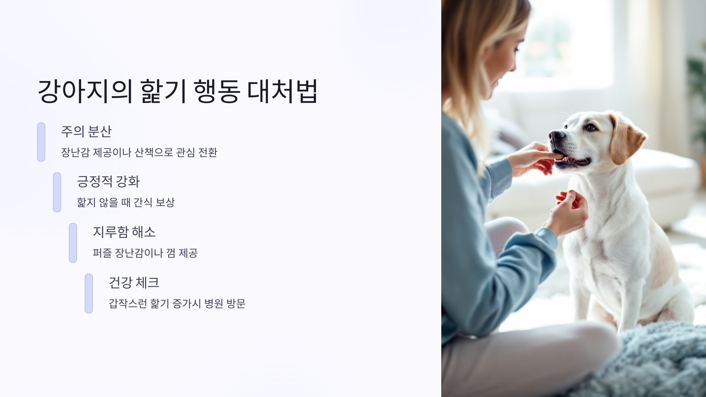 - 강아지가 핥는 행동을 보였을 때 감정적으로 꾸짖기보다는 차분하게 주의를 돌려야 합니다.