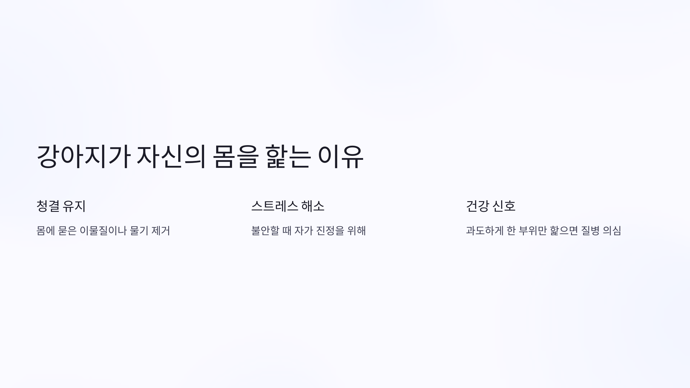 핥기 행동이 단순한 습관인지 건강 문제의 신호인지 파악하는 것이 중요하며, 필요할 경우 전문가의 상담을 받아 적절한 조치를 취하는 것이 가장 좋은 방법입니다.