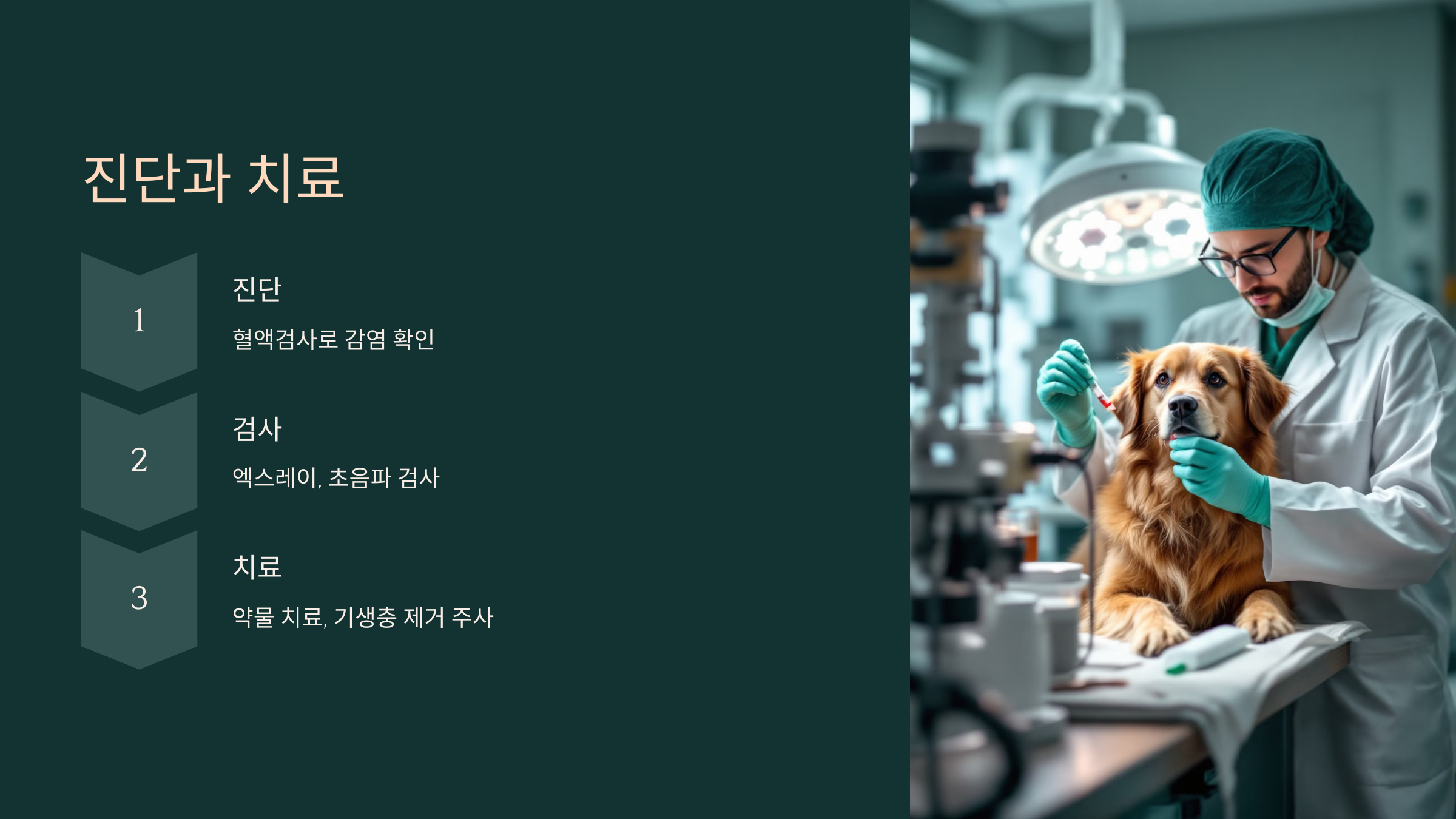 - 중증 감염(기침, 호흡곤란, 피로 등): 기생충 제거 주사 치료, 항생제, 항염증제, 심장 보호제 투여 필요