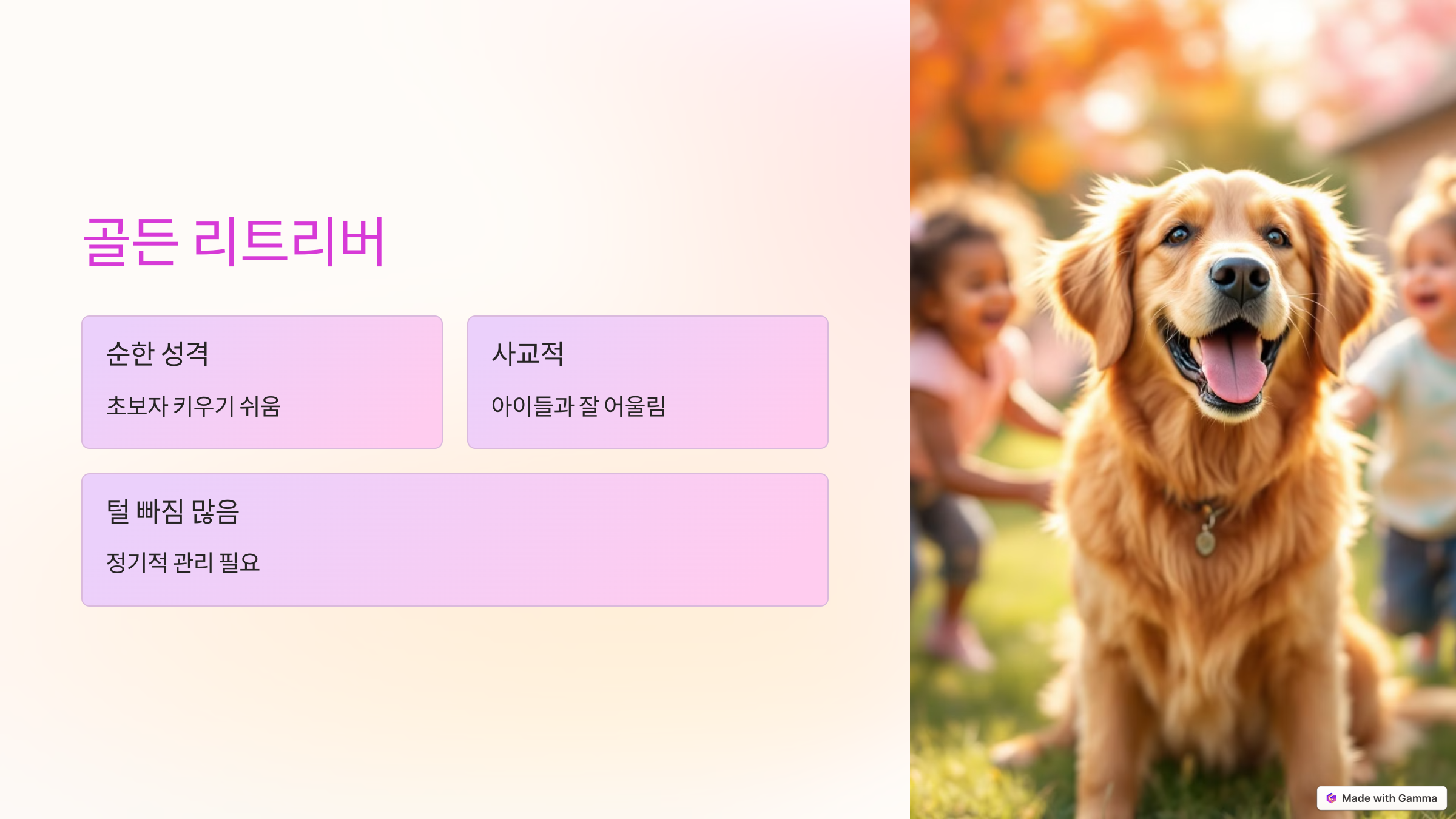 - 초보자 추천 이유: 골든 리트리버는 크기가 크지만, 순한 성격 덕분에 초보자도 쉽게 키울 수 있습니다. 특히 아이들과도 잘 어울려요.