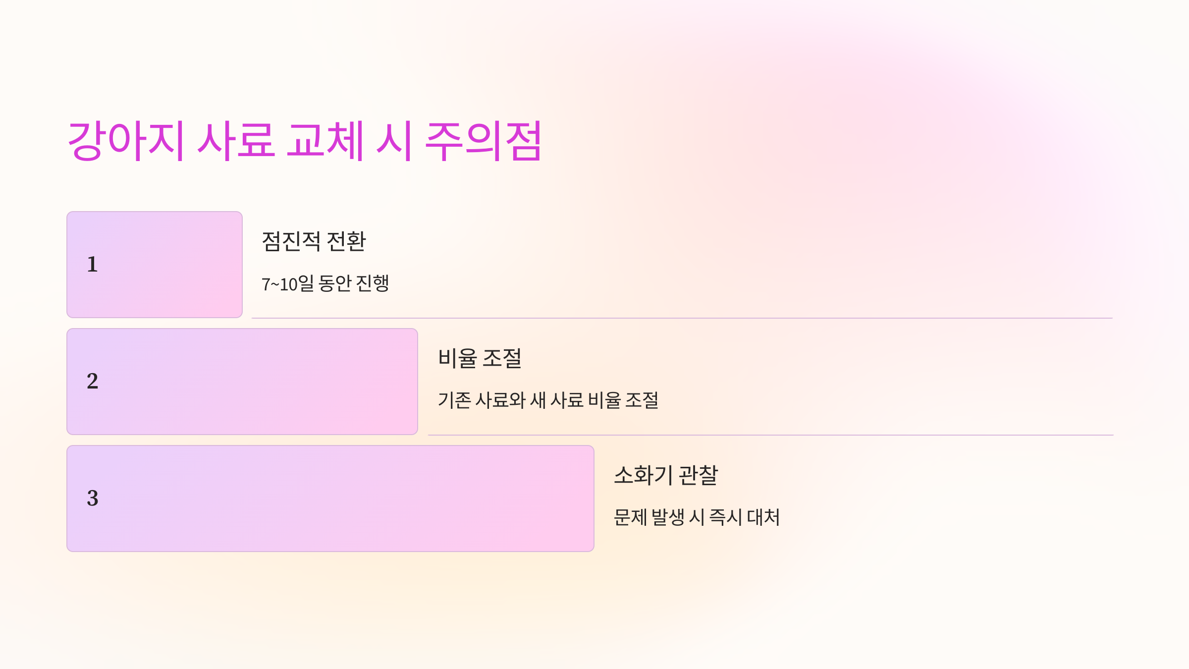 사료를 교체할 때는 갑작스러운 변경이 아닌 점진적인 전환이 필요합니다. 기존 사료와 새 사료를 섞어 비율을 점차 늘려가며 7~10일 동안 진행하세요. 이는 소화기 문제를 예방하는 데 효과적입니다.