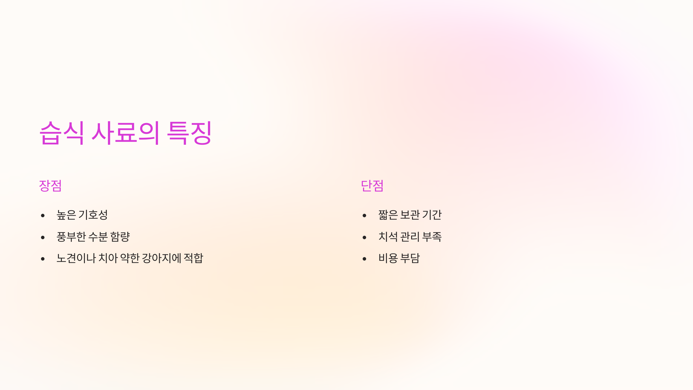 - 🚫 비용 부담: 건식 사료에 비해 가격이 높으며, 장기적으로 경제적 부담이 될 수 있습니다.